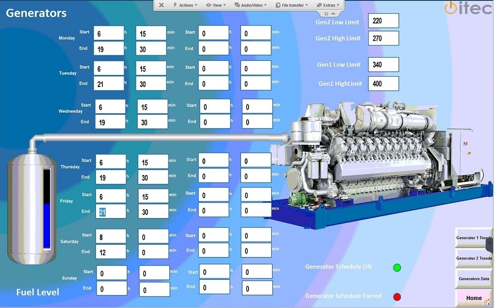 SCADA, for detailed monitoring, archiving and reporting of all the system parameters such as Fuel, power consumption, and many more